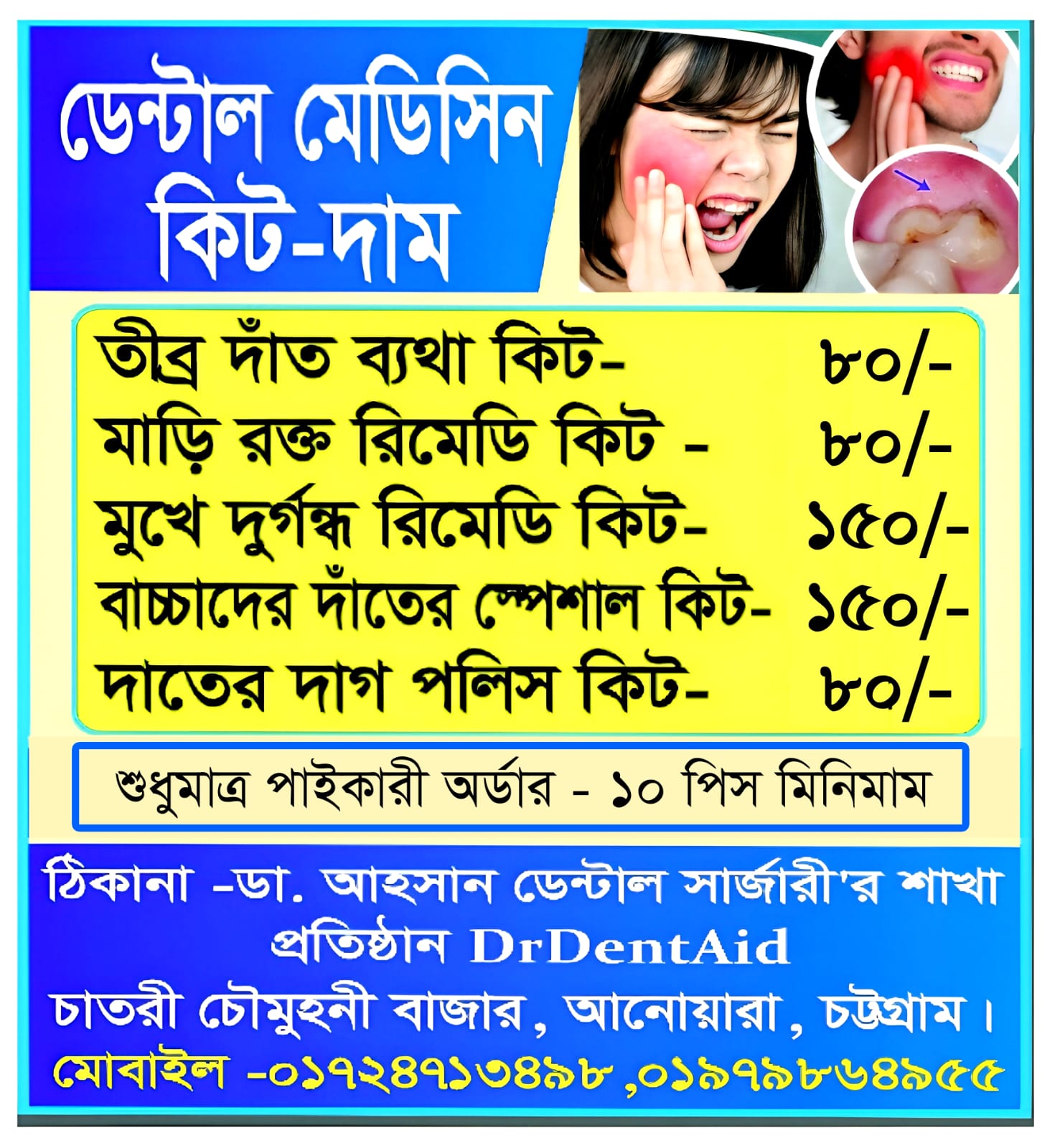 ৫. দ্রুত ব্যথা ও সমস্যা উপশমে কার্যকর – দাঁতের ব্যথা, মাড়ি রক্ত পড়া, মুখের দুর্গন্ধ—সব সমস্যার জন্য আলাদা কিট।